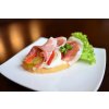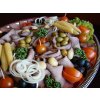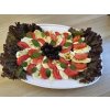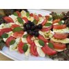 Obložená mísa s plátky čerstvých rajčat, mozzarellou a bazalkovým pestem, zdobené listovým salátem, olivami a bazalkou. Váha cca(400g)