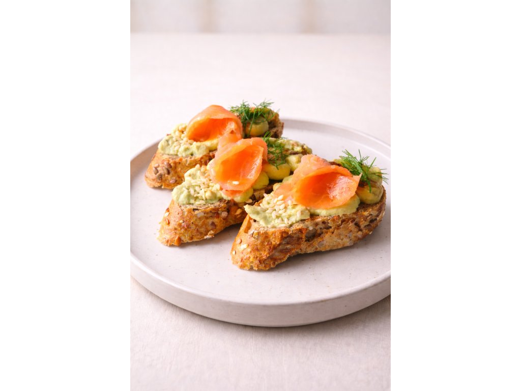 Francouzská tmavá bagetka, mazaná avokádovou pěnou, s plátky uzeného lososa, zdobené čerstvým koprem a sezamemPoznámka: Minimální počet k objednání 5 ks