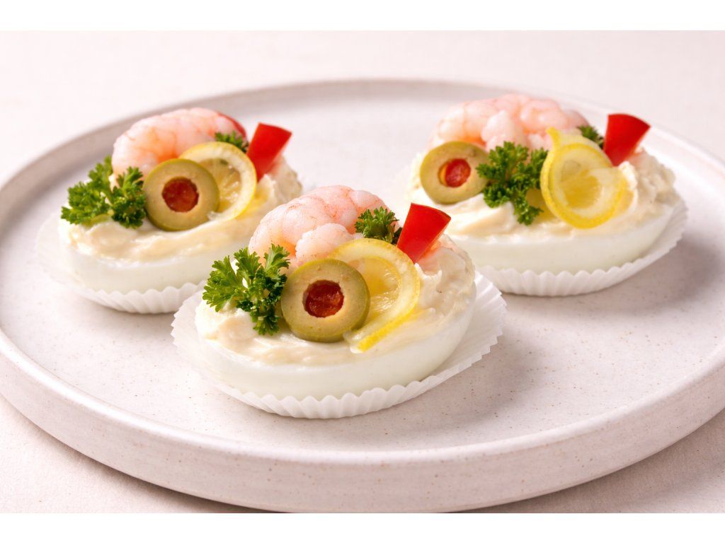 Rozkorojené vejce plněné pomazánkou ala krab, zdobené krevetkami, plátkem citronu a kapií