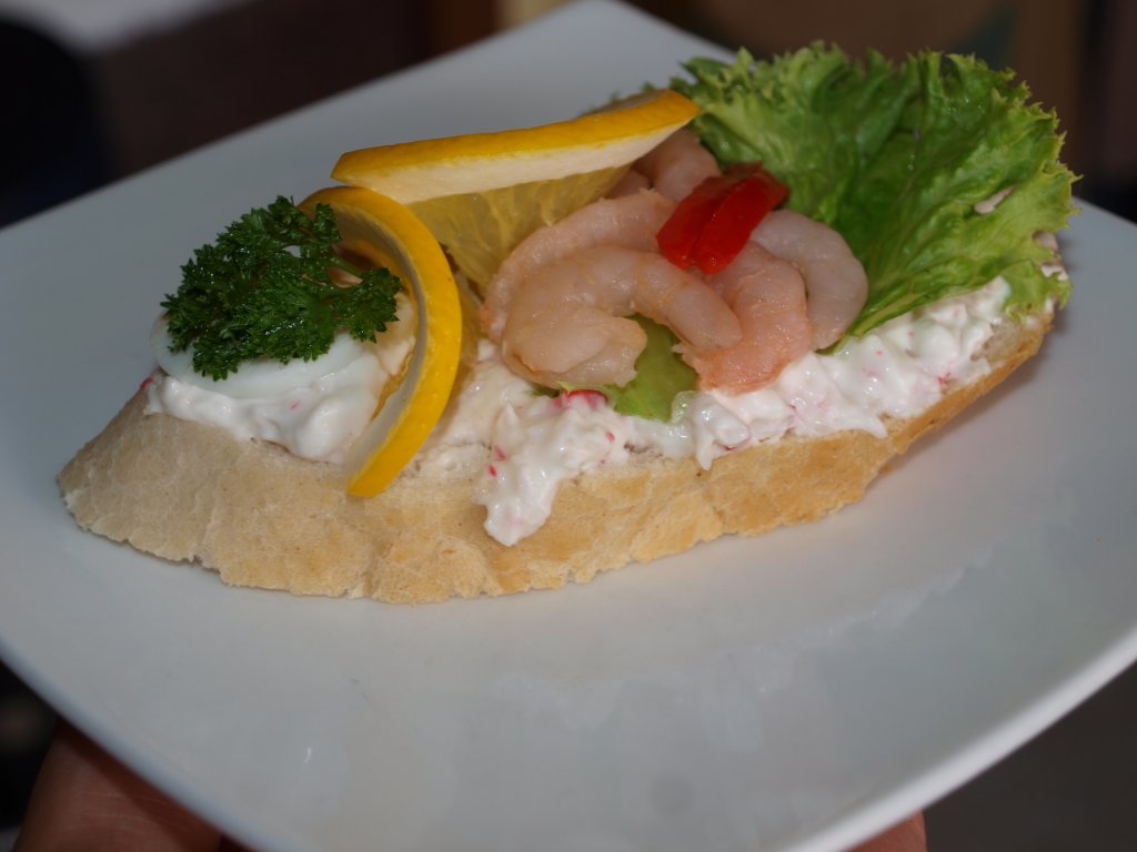 Plátek čerstvé veky, salát ala krab, krevety, plátek pomeranče, kapie, petrželka, čerstvý salát